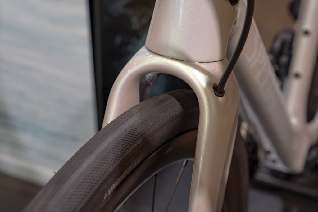 タイヤクリアランスはロードバイクとしては異例の38c対応。刻一刻と変化する多様な路面状況も太いタイヤなら余裕をもって走破できます。Future Shockも相まって、普通のロードバイクなら避けるべき段差やひび割れも気にする必要はありません。