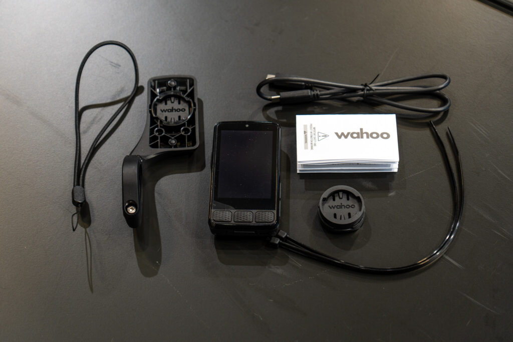 付属品はこの通り。Wahooならではのエアロなマウントが同梱されています。その他、充電ケーブルや落下防止のストラップも入っています。一方で、センサー類は付属してこないので未所持の場合は別途購入が必要になってきます。