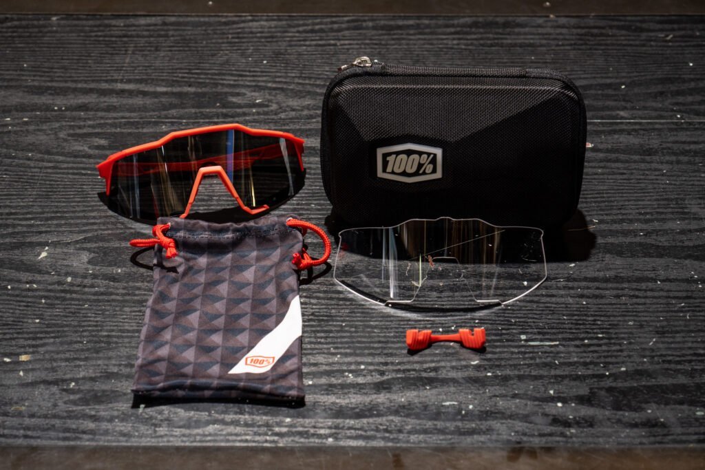 こちらは100%の付属品の一例です。サングラス本体の他、ハードケース、ポーチ、ノーズパッド(高、低)、そしてクリアレンズが入っています。