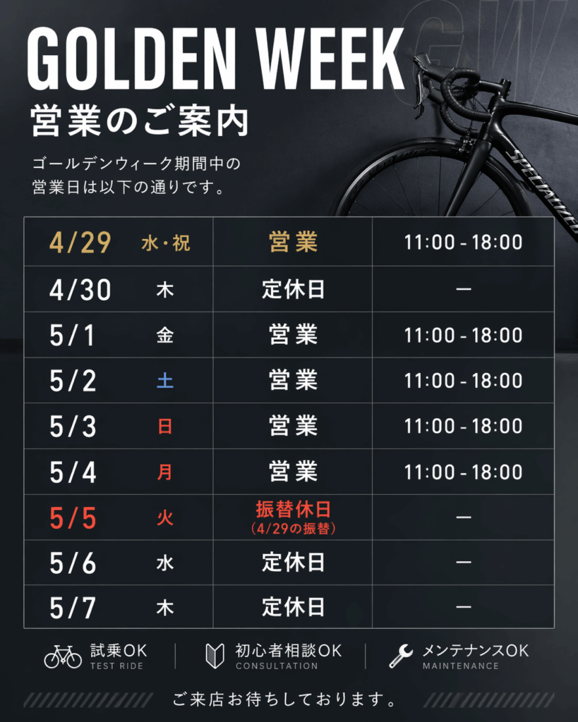 また、4月29日(水)~5月4日(月)までは営業時間が18:00までとなりますのでご注意ください。