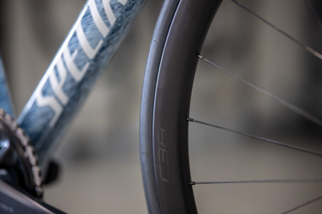 38mmハイトのカーボンリムは空力に優れ、平地はもちろんヒルクライムでも優秀です。そしてちょっとしたグラベルライドできるタフさを誇ります。