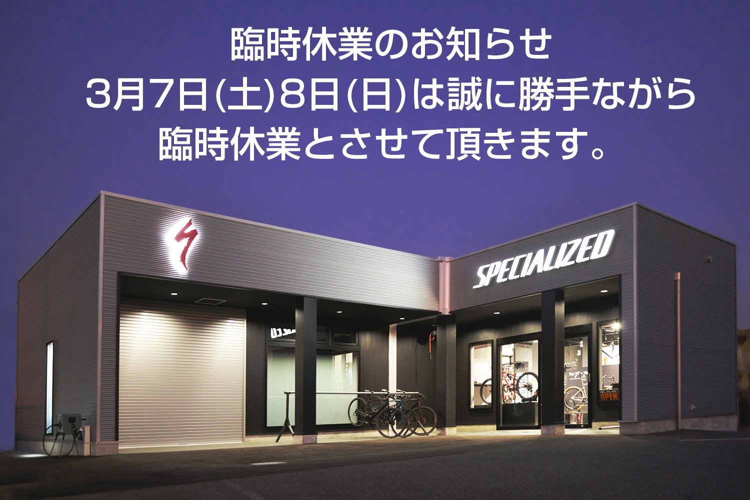 スタッフの都合により、急ではございますがスペシャライズド和歌山は3月7日(土)・8日(日)を臨時休業とさせていただきます。